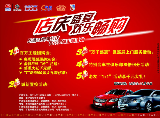 為回饋廣大客戶長(zhǎng)久以來(lái)對(duì)廣西弘通別克的支持和厚愛(ài),別克弘通11周年店慶百萬(wàn)回饋主題活動(dòng)。