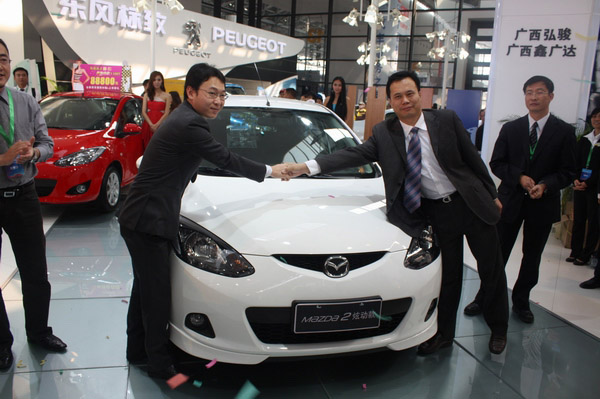 (廣西汽車(chē)網(wǎng) 訊) 繼11月15日Mazda2(兩廂)、Mazda2勁翔(三廂)“炫動(dòng)款”全球上市后,12月2日,“炫動(dòng)款”Mazda2再次亮相第三屆南寧國(guó)際車(chē)展現(xiàn)場(chǎng),舉行上市活動(dòng),讓廣西朋友充分感覺(jué)精彩一刻,長(zhǎng)安馬自達(dá)廠家市場(chǎng)總監(jiān)祝先生親臨上市現(xiàn)場(chǎng),并與廣西機(jī)電集團(tuán)總經(jīng)理助理陳圣維先生、長(zhǎng)安馬自達(dá)弘駿4S店陳總經(jīng)理、鑫廣達(dá)長(zhǎng)安馬自達(dá)酷馬店王總經(jīng)理一起為新車(chē)揭幕。