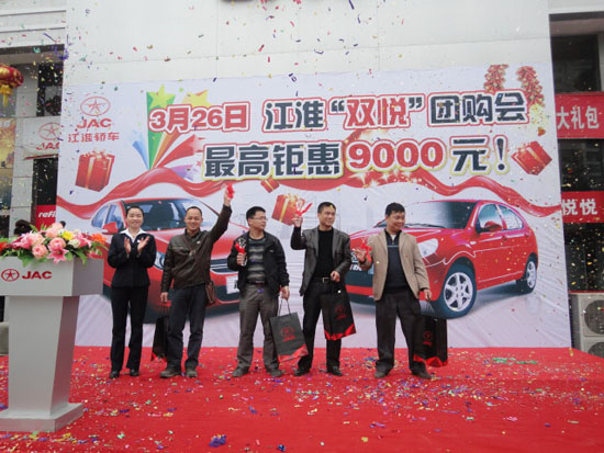 3月26日,江淮“雙悅”團購會成功落幕,自興弘公開此次團購現(xiàn)金優(yōu)惠9000以后,便受許多網(wǎng)友的關(guān)注,此外,活動當(dāng)天興弘4S店還在現(xiàn)場舉行智力搶答和多重好禮相送,更是吸引了許多朋友前來搶購,據(jù)了解,當(dāng)天到店人數(shù)高達90多人,現(xiàn)場座無虛席,高額的現(xiàn)金優(yōu)惠和多重好禮相送便促成了51臺好成績。