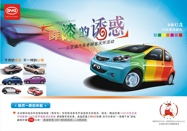翔遠(yuǎn)宏盛服務(wù)店為了回饋老顧客一直以來對我店的支持和厚愛,特開展“鮮漆的誘惑”比亞迪汽車?yán)项櫩完P(guān)愛活動。5月20日—6月20日,凡回家的老顧客均可享受全車噴漆、換漆大優(yōu)惠,不同的顏色,不一樣的心情;更換整車密封條、底盤膠套工時8折優(yōu)惠;屆時還可以參加游戲贏取千元驚喜!