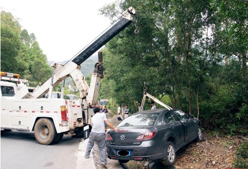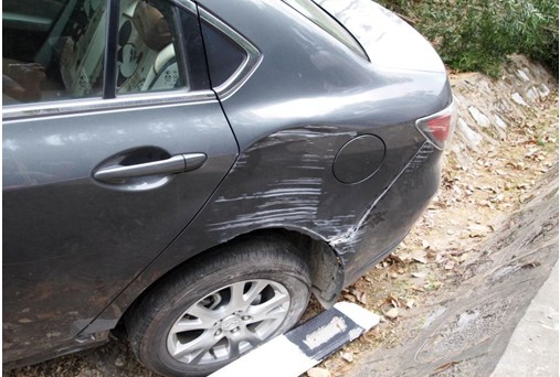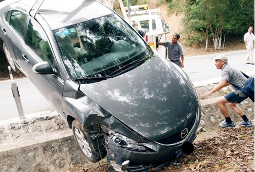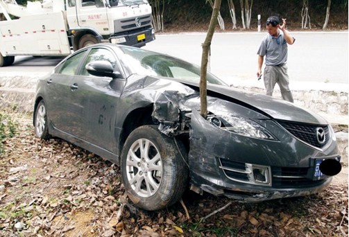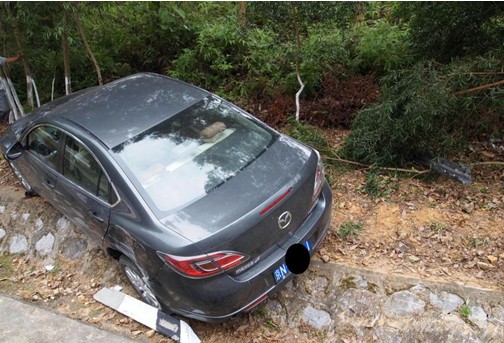 當(dāng)車子進(jìn)入了巴馬界,就迎來(lái)多段連續(xù)急拐彎兼下坡的路段。沒(méi)想到,車子剛開(kāi)過(guò)了懸崖路段,在接近燕洞鄉(xiāng)的路段,前方迎來(lái)的卻是一個(gè)連續(xù)急拐彎的下坡路,當(dāng)時(shí)老公的車速不低于80碼(評(píng):瘋子,這種路段車子再少也不能這么高的速度。。囎釉诠諒澋臅r(shí)候越出了行駛路線,當(dāng)老公采取急剎車的時(shí)候(評(píng):這時(shí)候不能急剎車,踩死剎車等于讓車大甩尾),整個(gè)車子橫過(guò)來(lái)了,直接偏向了右邊,騰空飛越了一條一米寬的水泥溝,然后撞倒了路邊的防護(hù)水泥柱,再?zèng)_向水泥柱外面的樹(shù),掃倒了幾棵樹(shù),車子的尾部再滑下了水泥溝,車頭前右方的大燈撞向一棵樹(shù),整棵樹(shù)干都插進(jìn)了右方的車頭大燈,車子終于停下來(lái)了!