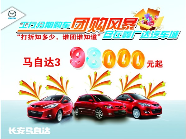 “打折知多少,誰團(tuán)誰知道”。!工行攜手鑫廣達(dá)八大品牌汽車于2011年8月20日在鑫廣達(dá)汽車城內(nèi)舉行一次大型團(tuán)購活動,只要您前來參與,我們都有禮品贈送,只要您到店購車將有意外驚喜;本著讓更多的人能夠開上馬自達(dá)車的理念,鑫廣達(dá)長安馬自達(dá)更是做出了前所未有的大讓利,馬自達(dá)3更是成本價(jià)銷售,團(tuán)購日當(dāng)天購買馬自達(dá)3 僅98000元起、馬自達(dá)2 僅79900元起,更有豪禮相送。。