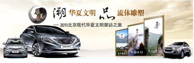 作為2010年北京現(xiàn)代“三山五岳”文化探訪活動的延續(xù)與提升,2011年活動以“溯?華夏文明,品?流體雕塑”為主題,強調(diào)對自然審美和傳統(tǒng)藝術(shù)的探訪,并邀請車主、媒體與藝術(shù)家共同尋訪雁蕩山、廬山和黃山這三座名山。車隊將尋訪自然山水與人文藝術(shù)的美學(xué)特征,在此過程中品味 “流體雕塑”設(shè)計理念,以及其與北京現(xiàn)代品牌、“流體雕塑”設(shè)計理念之間的文化淵源。