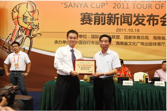 10月20日,2011“環(huán)海南島國際公路自行車賽”(以下簡稱“環(huán)島賽”)在海南正式開賽。身為“亞洲頂級”(2.HC級)賽事,本屆“環(huán)島賽”吸引了來自全世界的137名選手齊聚海南島,將在9天的時間內(nèi)爭奪38萬美金的高額獎金。在19日的賽前新聞發(fā)布會上,作為環(huán)島賽最親密的合作伙伴,海馬汽車第六次從主辦方手中接過合作牌匾,正式成為環(huán)島賽全程唯一指定用車的贊助商。