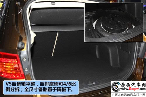 雖不見得十分寬敞,但符合大多數(shù)國人的乘坐空間要求。唯一讓人不滿的是,中華V5后排地臺凸起太高,和幾乎全平的全球鷹GX7相比,中間乘客的舒適性立馬見了高低。中華V5的行李箱容積看上去還不錯,但地板之下就只是安放備胎和一些小物品,既沒有暗格也沒有修飾,看上有些粗糙凌亂。