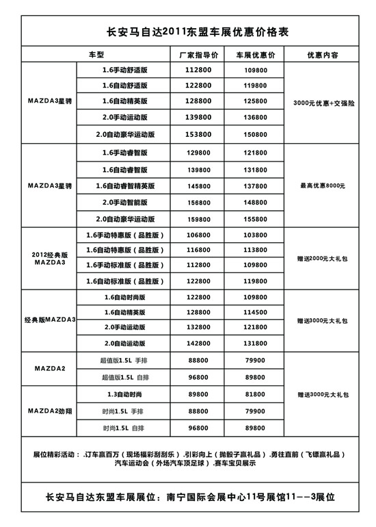 長(zhǎng)安馬自達(dá)弘駿全系出擊2011東盟國(guó)際車展,隆重推出多重好禮現(xiàn)金送不停,最高優(yōu)惠高達(dá)8000元,訂車還有機(jī)會(huì)贏取百萬(wàn)大獎(jiǎng),此外還有多種游戲贏好禮任你選,讓您逛展如逛街,滿載而歸!