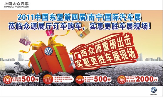 12月1-5日,2011年中國東盟第四屆(南寧)國際汽車展廣西眾源重裝上陣!廣西眾源攜邕城上海大眾經(jīng)銷商亮相本屆車展!廣西眾源重磅出擊,展覽會期間,上海大眾廣西眾源4S旗艦店在秀廂大道199號展廳內(nèi)開展東盟國際汽車展展廳專場活動。蒞臨廣西眾源展廳購車,優(yōu)惠更勝車展現(xiàn)場!