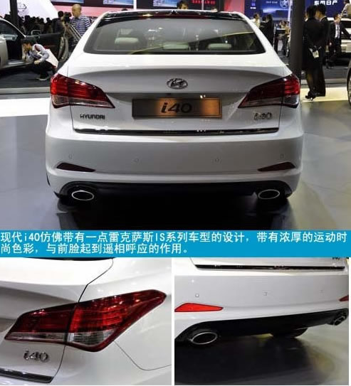 從車尾正面看,現(xiàn)代i40仿佛帶有一點(diǎn)雷克薩斯IS系列車型的設(shè)計(jì),帶有濃厚的運(yùn)動(dòng)時(shí)尚色彩,與前臉起到遙相呼應(yīng)的作用。整體造型比較厚實(shí),只是體現(xiàn)不出流體雕塑的設(shè)計(jì)風(fēng)格,修長(zhǎng)的尾燈設(shè)計(jì)讓其動(dòng)感十足,一體式后擾流造型設(shè)計(jì)同樣出現(xiàn)在i40身上,無(wú)疑增大其層次感。