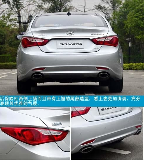 國(guó)產(chǎn)新款索納塔在“流體雕塑”設(shè)計(jì)方面,可謂是至始至終,特別是其兩側(cè)上揚(yáng)而且?guī)в猩下N的尾部造型,看上去更加協(xié)調(diào),雖然尾燈同樣采用修長(zhǎng)設(shè)計(jì),但整體風(fēng)格比i40來(lái)得更有感覺(jué),加上燈組之間的鍍鉻裝飾橫條,充分表現(xiàn)其優(yōu)雅的氣質(zhì)。此外,尾箱邊緣的后擾流板和分居兩側(cè)的雙排氣管,為其增添一絲運(yùn)動(dòng)色彩。