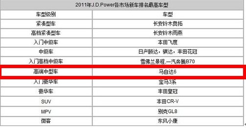 日前,在J.D.Power亞太公司公布的“2011年中國新車質(zhì)量研究SM(IQS)報告”中,馬自達(dá)6表現(xiàn)突出,再次榮膺J.D.Power中國新車質(zhì)量研究“中高級車新車質(zhì)量滿意度冠軍”。