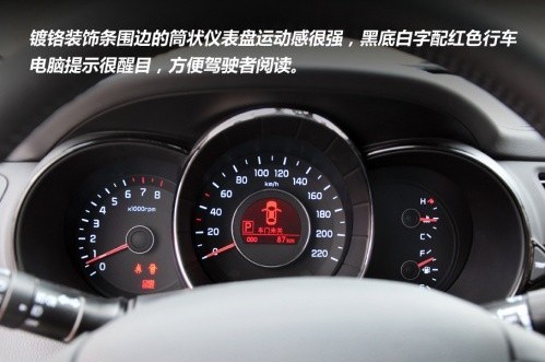 三幅式多功能方向盤尺寸適中,手感也比較舒適,炮筒式儀表盤同樣有鍍鉻裝飾,黑底白字的設(shè)計很醒目,中央紅色的行車電腦顯示屏涵蓋了瞬時油耗、檔位提示、行駛里程等功能。