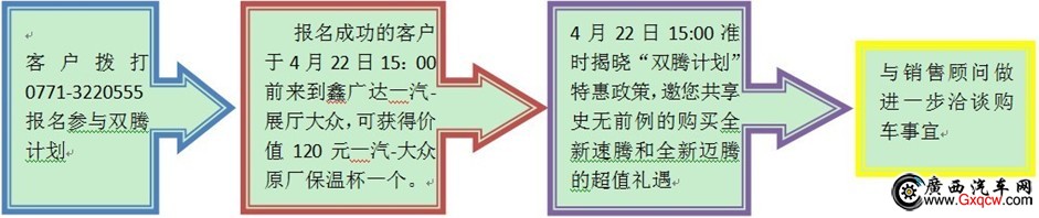 第一步:即日起至4月22日,通過(guò)撥打0771-3220555成功報(bào)名,且在活動(dòng)當(dāng)天到達(dá)展廳參與活動(dòng)的客戶,即可獲得價(jià)值120元一汽-大眾原廠保溫杯一個(gè)。