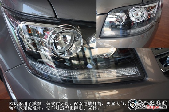 歐諾采用了熏黑一體式前大燈,配雙電鍍燈筒,更顯大氣,安裝結(jié)構(gòu)采用轎車式定位設(shè)計,使車燈造型更鮮明、立體。
