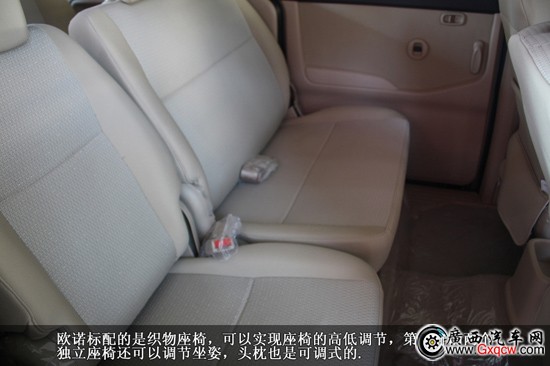 歐諾空間采用三排座椅式設(shè)計,車內(nèi)空間十分寬裕,前兩排都帶有座椅頭枕,也增加了其乘坐的舒適性。歐諾標配的是織物座椅,可以實現(xiàn)座椅的高低調(diào)節(jié),第二排的兩個獨立座椅還可以調(diào)節(jié)坐姿,頭枕也是可調(diào)式的,這樣一來,其乘坐舒適性相對微面來說這更占優(yōu)勢。不過不得不在這里提及一下,第二排座椅不能前后移動。第三排空間對于一個成年人來說算得上是勉強能坐下,腿部空間稍顯局促,對于長途乘坐人員會影響其舒適性。