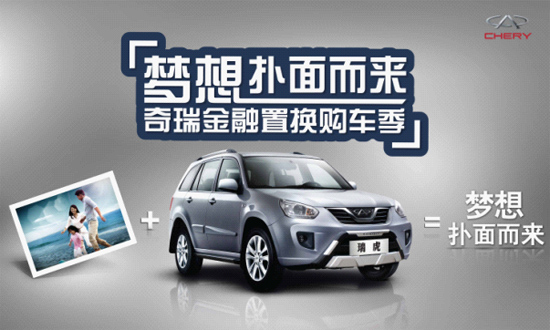 為能減少消費(fèi)者在舊車處理時的經(jīng)濟(jì)損失,目前奇瑞還特別推出“夢想撲面而來--奇瑞瑞虎金融置換季”大型活動。