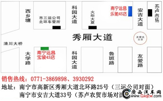 銷售熱線:0771-3930292(樂馳店)、0771-3869898(寶駿店)