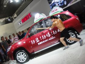 一棒、兩棒、三棒……,當(dāng)巨大的敲擊聲響起,奇瑞展臺早已被擁擠的人群包圍的水泄不通。只見一位赤膊上身,滿身肌肉的壯漢,此刻正掄圓了手中的胳膊粗的壘球棒,向著面前一輛SUV的車窗再次狠狠砸去。隨著“砰”的一聲巨響,那塊已經(jīng)遍布裂痕,看似搖搖欲墜的車窗,卻依然奇跡般的紋絲未動。而壯漢手中的那根壘球棒,卻不堪連續(xù)打擊段為兩截。雷鳴般的掌聲瞬間從人群中爆發(fā)而出,瑞虎好車!瑞虎真棒!的贊美聲更是不絕于耳。