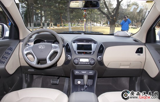 內(nèi)飾設(shè)計(jì)上,北京現(xiàn)代 ix35的中控面板呈X型延伸,各功能按鈕布局合理,操作簡(jiǎn)便,藍(lán)色的背景燈光令駕乘者更便于閱讀。中控臺(tái)兩邊 的空調(diào)出風(fēng)口分別與發(fā)動(dòng)機(jī)啟動(dòng)和玻璃加熱按鍵搭配,成為中控面板X造型的延續(xù)。與中控板X造型呼應(yīng)的是X造型四輻式多功能方向盤,給人不錯(cuò) 的視覺(jué)感受。雙筒式儀表盤是運(yùn)動(dòng)車型的典型特征,紅白兩色的傳統(tǒng)指針儀表讓車速、發(fā)動(dòng)機(jī)轉(zhuǎn)速一目了然。