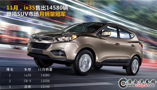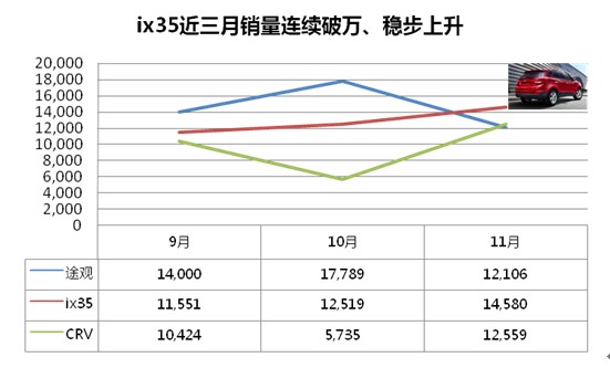 11月,北京現(xiàn)代ix35售出14,580輛,擊敗東風(fēng)本田CR-V、上海大眾途觀,再次成為國內(nèi)SUV市場月銷量冠軍。這已經(jīng)是ix35連續(xù)三月銷量突破1萬輛大關(guān)。與途觀、CR-V出現(xiàn)的大幅波動(dòng)不同,ix35的市場表現(xiàn)顯得十分穩(wěn)定,在進(jìn)入9月后銷量一直穩(wěn)步上升,并登頂銷量榜單。與此同時(shí),ix35的其同門兄弟途勝也在11月售出5000輛,名列榜單第六。