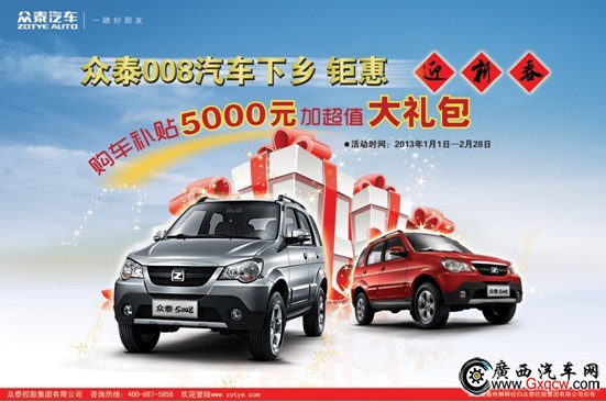 新春佳節(jié)到來之際,為回饋廣大新老車主厚愛,眾泰汽車在2013年1月1日—2013年2月28日推出“眾泰008汽車下鄉(xiāng) 鉅惠迎新春”系列促銷活動(dòng)。凡在活動(dòng)期內(nèi)到店購買008系產(chǎn)品(含眾泰2008、眾泰5008),現(xiàn)金優(yōu)惠5000元,另有豪華大禮包相送。具體車型優(yōu)惠報(bào)價(jià)如下表: