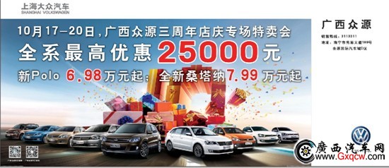 喜迎廣西眾源三周年店慶,上海大眾全系濃情盛意。10月17日-20日,廣西眾源三周年店慶專(zhuān)場(chǎng)特賣(mài)會(huì),上海大眾全系全線放價(jià)!廣西眾源三周年店慶感恩回饋,車(chē)展場(chǎng)地費(fèi)全線讓利購(gòu)車(chē)款,補(bǔ)貼您的購(gòu)車(chē)優(yōu)惠。活動(dòng)期間上海大眾全場(chǎng)最高優(yōu)惠25000元,新Polo 6.98萬(wàn)元起、全新桑塔納7.99萬(wàn)元起!