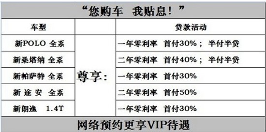 按揭購(gòu)車(chē)成為越來(lái)越多的買(mǎi)車(chē)一族首選,但是利息、擔(dān)保費(fèi)卻也是不可避免的一道門(mén)檻。您是否還在為每個(gè)月車(chē)貸而倍感壓力?還款同時(shí)附加銀行的高額利息而憤憤不平?除此之外,還在為買(mǎi)車(chē)需要高額的擔(dān)保費(fèi)而焦頭爛額嗎?你想擁有高品質(zhì)的車(chē),卻又為這些原因遲遲猶豫不決,你的這些顧慮,終于有人來(lái)幫你買(mǎi)單了:上海大眾廣西眾源公司聯(lián)合上汽財(cái)務(wù)現(xiàn)針對(duì)熱銷(xiāo)車(chē)型推出“您購(gòu)車(chē)我貼息”零利率金融方案,讓您購(gòu)車(chē)?yán)碡?cái)兩不誤,輕輕松松開(kāi)車(chē)回家——New Polo / 新帕薩特/ 全新桑塔納/ 新朗逸1.4T/ 途安分期購(gòu)車(chē)0利率,首付低至30%,半付半貸。真正零風(fēng)險(xiǎn)(不需房產(chǎn)抵押)的按揭購(gòu)車(chē)。