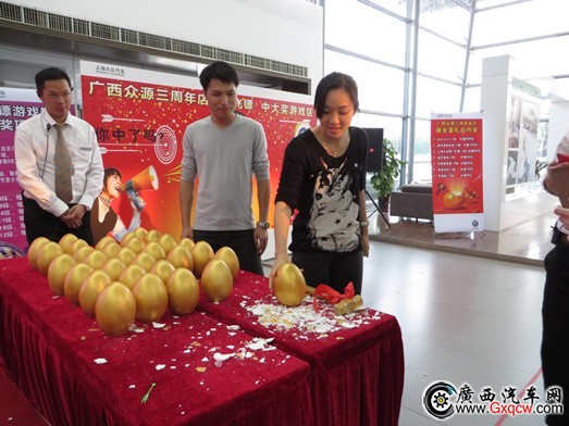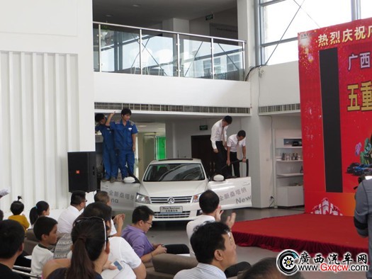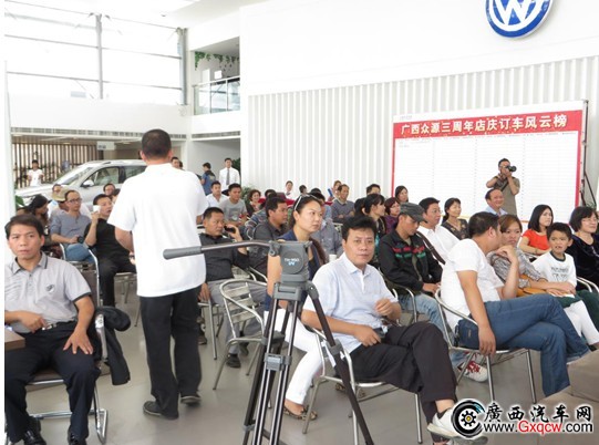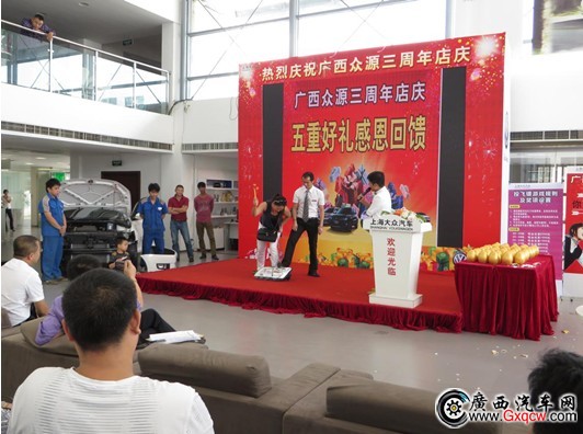 26日中午13:00活動(dòng)正式啟動(dòng),廣西眾源店付總經(jīng)理上臺(tái)致詞,感激各位車友三年來對眾源店的支持和陪伴。當(dāng)天最吸引人眼球的表演莫過于砸車燈的演示。主持人讓四個(gè)工作人員分別站在全新桑塔納的車門上,讓現(xiàn)場的客戶親眼見識到大眾汽車車身的堅(jiān)固品質(zhì)。隨后,講解人員讓售后技師拆下桑塔納車燈,并邀請市場部王總監(jiān)和現(xiàn)場客戶用錘子砸車燈,讓人們驚喜的是,有“小帕”之稱的新桑塔納沒有讓大家失望,在經(jīng)過大家猛勁砸過之后,依然完好無損,并且在售后技師把車燈再次安裝到車上后,“小帕”的眼睛又亮了起來。