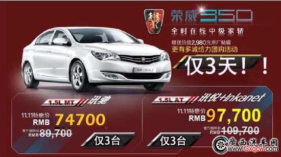 11月9日—11日,隨著網(wǎng)絡(luò)購物市場的高速發(fā)展,現(xiàn)在參與網(wǎng)購的人群日益廣泛,而今年榮威聯(lián)合雙十一促銷活動可算為購物狂歡節(jié)的熊熊火焰再添了一把柴火,F(xiàn)在榮威對旗下全新榮威550、350、W5等多款熱門車型進(jìn)行促銷。