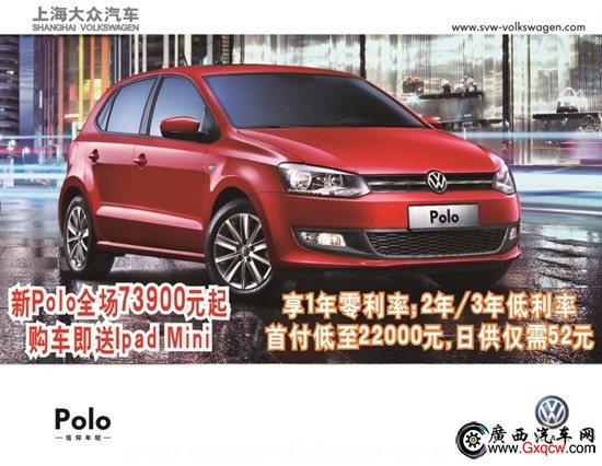 現(xiàn)在購(gòu)買(mǎi)新Polo,即可尊享團(tuán)歲末瘋狂團(tuán)購(gòu)價(jià)優(yōu)惠,全系15000元現(xiàn)金鉅惠及蘋(píng)果iPad mini平板電腦超值贈(zèng)送。貸款購(gòu)車(chē)更可享受優(yōu)惠金融計(jì)劃包括“1年0利率、2年/3年低利率活動(dòng)”。首付低至22000元,日供僅需52元,超低門(mén)檻,現(xiàn)車(chē)充足,輕松擁有!