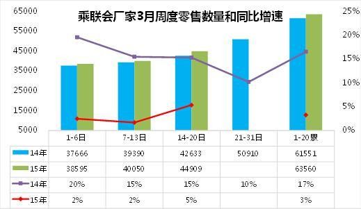 縱觀全國市場,全國乘聯(lián)會最近公布的數(shù)據(jù)顯示,3月車市零售處于低位平穩(wěn)態(tài)勢:3月第一周車市零售同比14年3月第一周增速2%,第二周車市同比增速2%,第三周同比增速回升到5%。前三周同比增速為3%,尚處于低速增長中。