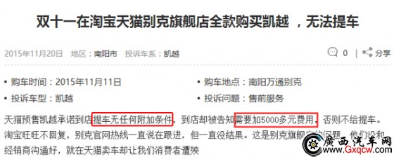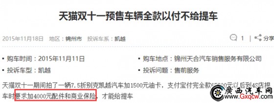 經(jīng)本網(wǎng)工作人員調(diào)查了解,這些消費者均于今年雙11期間參加了別克天貓店的促銷活動,并以較低的價格購買了凱越汽車,同時對方承諾提車時無需其他附加條件;然而當(dāng)他們實際去到4S店時,卻無不被告知需加價購買對方的裝潢、保險等產(chǎn)品方能拿車。當(dāng)初的承諾為何敢公然食言,難道這次雙11活動,上汽通用僅僅是為了在電商平臺上刷一個漂亮的銷售數(shù)字而搞的噱頭?