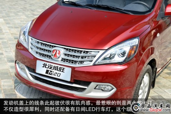 從外觀看北汽威望M20的上下進氣格柵采用了銀灰色的面板顯得比較醒目,仔細觀看,上格柵上還有鍍鉻細條以作裝飾之用。發(fā)動機蓋上的線條此起彼伏很有肌肉感。最惹眼的則是兩個前大燈,不僅造型很犀利,同時還配備有日間LED行車燈,這在這個級別的車型中并不多見。不規(guī)則的前霧燈除了最低配車型外,其他車型全部配備。