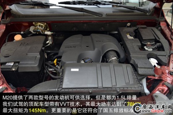 動力方面, M20提供了兩款型號的發(fā)動機可供選擇,但是都為1.5L排量。其區(qū)別就在于是否配有VVT技術(shù),我們試駕的頂配車型自然是帶有此技術(shù)的,其最大功率達到了78kW,最大扭矩為145Nm。更重要的是它還符合了國五排放標準。