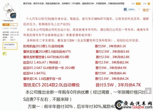 更令人擔心的是,目前南寧能提供“專車套餐”的多為車貸公司,他們成立時間不長、各方面水平良莠不齊,有的甚至沒有固定資產(chǎn)擔保和相關產(chǎn)業(yè),車輛所有權(quán)在這些公司手中,一旦他們將車輛售出或者抵押,購車者將遭遇面臨“車、錢兩空”的困境。