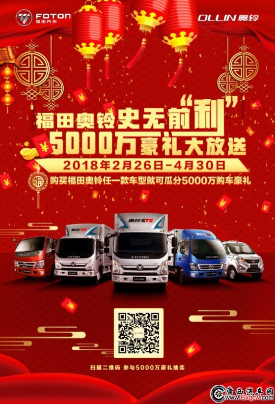 如果覺得到店禮不夠豪氣,還有購車禮。2月26日至4月30日,入門即是客,凡是到店購買福田奧鈴任意一款產(chǎn)品,均可獲得一次刮獎機會,全程給出購車禮,價值5000萬的四重豪禮大派送,中獎率100%。