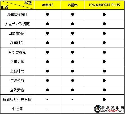 從配置上看,哈弗H2和名爵zs頂配車型都擁有兒童座椅接口、安全帶未系提醒、ABS防抱死、剎車輔助、牽引力控制、倒車影像、上坡輔助、定速巡航、全景天窗等配置。長安全新CS35 PLUS頂配版也擁有以上配置,還在其基礎上加了哈弗H2和名爵zs都沒有的騰訊車聯(lián)智能生態(tài)系統(tǒng)。