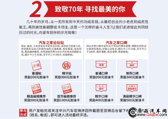 向愛(ài)車陪伴的歲月致敬,向中興汽車70年致敬!在活動(dòng)期內(nèi),中興汽車?yán)嫌脩艨梢酝ㄟ^(guò)廣西汽車網(wǎng)中興領(lǐng)主論壇、威虎論壇、小老虎論壇發(fā)布正向論壇帖講述自己的奮斗史,也可分享與愛(ài)車并肩作戰(zhàn)的點(diǎn)滴故事、用車感受、用車經(jīng)驗(yàn)、售后保養(yǎng)服務(wù)、自駕游經(jīng)歷等精彩瞬間。同時(shí),也可在廣西汽車網(wǎng)車型口碑發(fā)布關(guān)于領(lǐng)主的用車感受(動(dòng)力、油耗、空間、外觀、操控等),用圖文的形式分享用車體驗(yàn)(詳見(jiàn)中興汽車官網(wǎng)),最終根據(jù)論壇貼效果與口碑效果獎(jiǎng)勵(lì)加油卡。