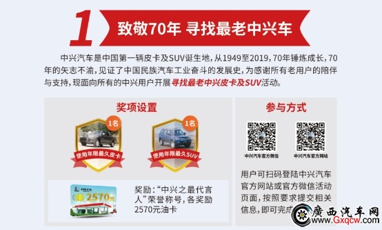 中興汽車是中國(guó)第一輛皮卡及SUV 誕生地,從1949年發(fā)展至今,歷經(jīng)70年錘煉成長(zhǎng),70年矢志不渝,中興汽車見(jiàn)證了中國(guó)民族汽車工業(yè)奮斗的發(fā)展史。為感謝老用戶70年的陪伴與支持,現(xiàn)面向所有的中興用戶開(kāi)展尋找最老中興皮卡(使用年限最久),最老中興SUV(使用年限最久)活動(dòng)。在活動(dòng)期內(nèi),中興汽車用戶可以通過(guò)店頭報(bào)名與線上報(bào)名兩種方式參與活動(dòng)(詳見(jiàn)中興汽車官網(wǎng)),最終按照評(píng)選標(biāo)準(zhǔn)選出最老中興皮卡及最老中興SUV各1輛,并授予車主“中興之最代言人”榮譽(yù)稱號(hào),同時(shí)獎(jiǎng)勵(lì)2570元加油卡。