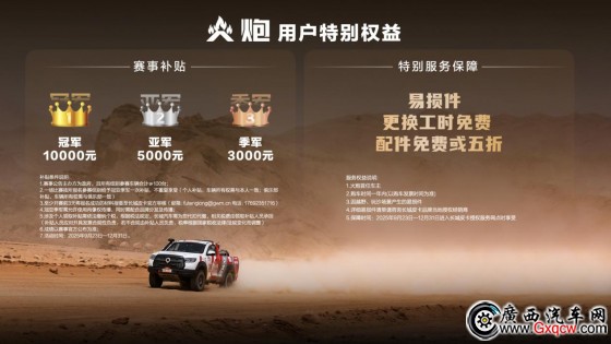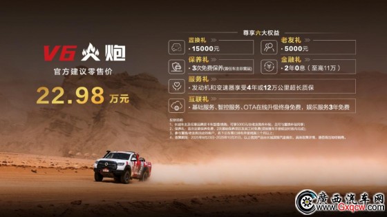 9月,賽級皮卡V6火炮正式上市,官方建議零售價22.98萬元,并同步推出15000元置換禮、5000元老友禮等六大權(quán)益。為滿足廣大用戶的需求和呼聲,凡駕駛V6火炮參加規(guī)模超過100臺賽車的政府舉辦的賽事,將給予冠亞季軍3000-10000元賽事補貼;同時,為降低車友玩車成本,針對火炮首任車主,一年內(nèi)因越野、玩沙場景損壞更換的易損件,更換工時免費,部分配件按市場指導價免費或五折提供。