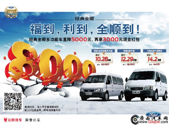 據(jù)獲悉,即日起至10月9日到廣西江鈴安吉4S店購江鈴全順指定車系即享現(xiàn)金讓利3000元,先到先得,趕快到店搶購吧!江鈴福特全順載您一路順到底!咨詢熱線:0771-3119811.