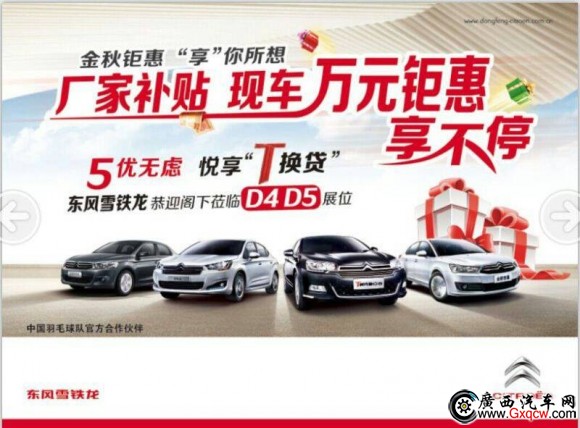 金秋鉅惠“享”你所想,本次北部灣車展東風(fēng)雪鐵龍——廠家補(bǔ)貼現(xiàn)車萬(wàn)元鉅惠享不停,5優(yōu)無(wú)慮 悅享“T換貸”。