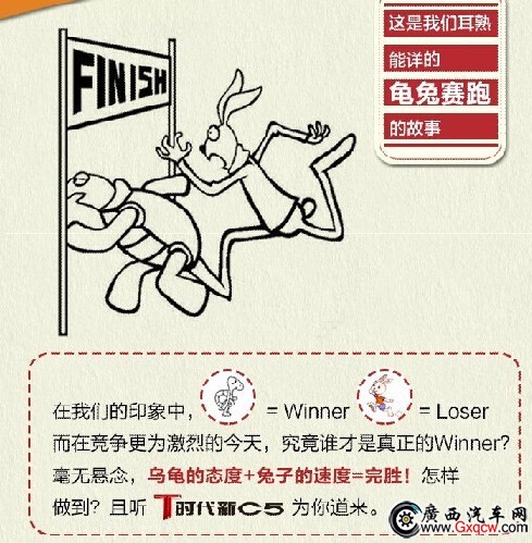 龜兔賽跑,誰(shuí)是loser誰(shuí)是winner? 領(lǐng)跑人生,是選擇兔子的速度,亦或是烏龜?shù)膽B(tài)度? 不必為難,有速度更要有態(tài)度! T時(shí)代新C5,帶您領(lǐng)跑完美人生!