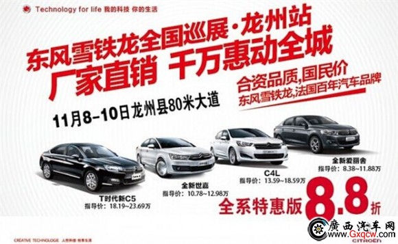 金榜狀元紅,榮耀豪禮送。東風(fēng)雪鐵龍,法國百年汽車品牌。合資品牌,國民價,2014年11月8日—10日龍州80米大道,東風(fēng)雪鐵龍全系特惠版8.8折,訂車還有豪禮送。