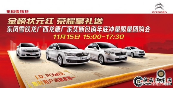 百年歷史品牌,成就法國總統(tǒng)座駕。歐系車品質(zhì),法蘭西的浪漫情懷。東風(fēng)雪鐵龍榮登2014年J.D.POWER中國銷售滿意度指數(shù)研究榜首,值此榮耀時(shí)刻,2014年11月15日,東風(fēng)雪鐵龍廣西龍康與廠家開展“東風(fēng)雪鐵龍廠家買斷包銷年底沖量限量團(tuán)購會”;顒悠陂g購車享團(tuán)購會沖量限量最“抵”價(jià),錯過就再等一年啦!趕緊撥打電話報(bào)名參加吧!0771-4853366
