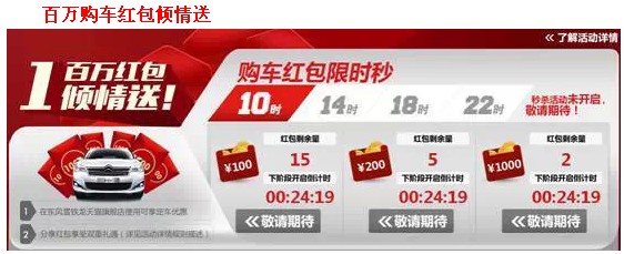 11月1日-11月20日,紅包秒殺階段,東風雪鐵龍準備了100-10000元紅包傾情贈送,趕緊練就下手快準狠的絕招,超大紅包就是你的,小伙伴們還等什么,趕快開搶!