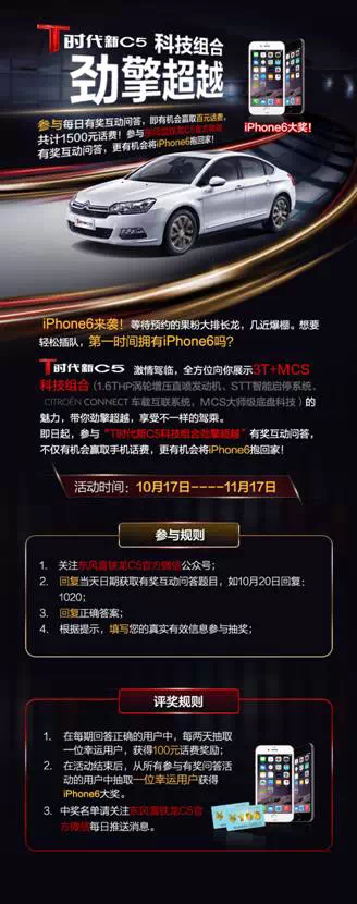 暢想科技生活,大膽想象,勇于嘗試,T時(shí)代新C5一直致力于完善每個(gè)夢(mèng)想,讓行車生活更加智能,更加美好。想了解T時(shí)代新C5如何實(shí)現(xiàn)你的所想,就來參與#T時(shí)代新C5科技組合勁擎超越#有獎(jiǎng)互動(dòng)問答,敢想敢做,就有機(jī)會(huì)獲得100元手機(jī)話費(fèi)獎(jiǎng)勵(lì),更有機(jī)會(huì)將iPhone6直接抱回家!