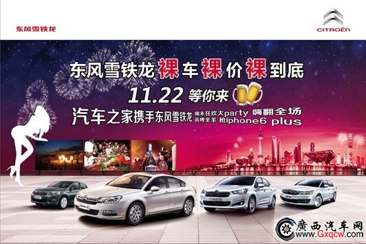 那么問題來了,團(tuán)購力度哪家強(qiáng)?找東風(fēng)雪鐵龍11.22裸車裸價(jià)裸到底,南寧車市一股購車狂歡大派對正席卷而來! 11月22日,汽車之家攜手東風(fēng)雪鐵龍舉辦“裸車裸價(jià)裸到底”活動(dòng)鄭重承諾,價(jià)格突破底線,全年最低,買貴補(bǔ)差價(jià),不需您勞心勞力砍價(jià),只需動(dòng)動(dòng)您的手指,就能輕松獲得底價(jià),到店試駕即送法國高檔紅酒一支!參與活動(dòng)不僅能享受特惠價(jià)格,當(dāng)天購車還可參加抽獎(jiǎng)活動(dòng),Iphone6 plus,52電視機(jī),Ipad mini,山地自行車,拉桿箱等等多重豪禮拿到你手軟,購車后上傳發(fā)票還可再獲得汽車之家送出的金屬質(zhì)感車標(biāo)哦!當(dāng)天前20名訂車的網(wǎng)友均可獲贈(zèng)價(jià)值580元的拉桿箱一個(gè)。來吧!周末帶上您的家人,加入我們的狂歡大派對,吃個(gè)夠喝個(gè)夠玩?zhèn)夠! |