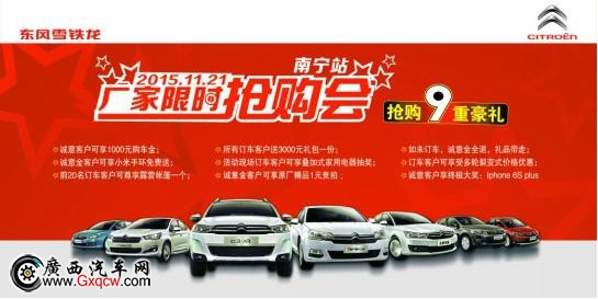 東風(fēng)雪鐵龍“限時(shí)搶購(gòu)會(huì)”南寧站活動(dòng)廣西龍康專(zhuān)場(chǎng)將在2015年11月21日舉行,廠家主辦,年度大促,錯(cuò)過(guò)今次,再等一年! 采取臺(tái)階讓利模式,促銷(xiāo)讓利幅度不設(shè)上限。
