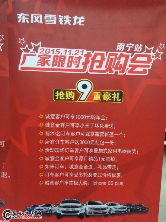 東風(fēng)雪鐵龍“限時(shí)搶購(gòu)會(huì)”南寧站活動(dòng)廣西龍康專場(chǎng)將在2015年11月21日舉行,廠家主辦,年度大促,錯(cuò)過今次,再等一年! 采取臺(tái)階讓利模式,促銷讓利幅度不設(shè)上限。