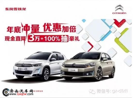 優(yōu)惠1、年底沖量 優(yōu)惠加倍——東風雪鐵龍現金直降3萬+購車100%抽豪禮。